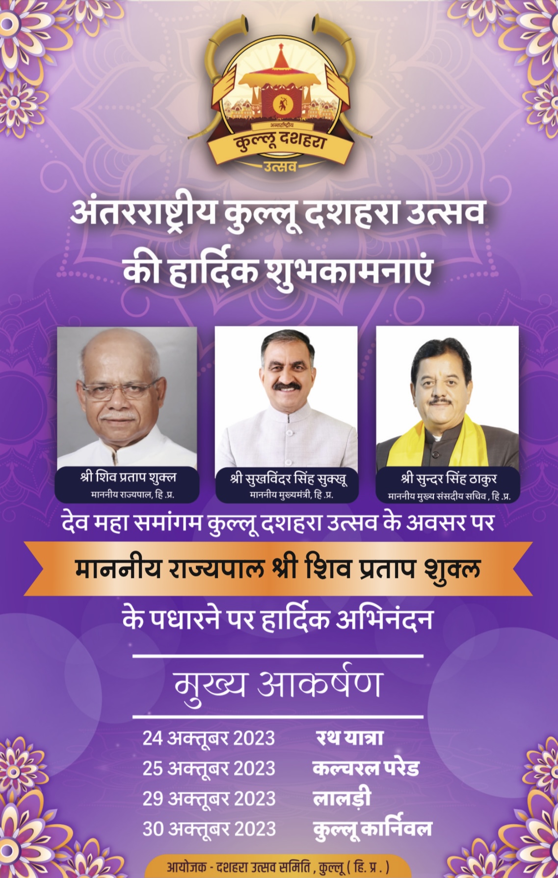इससे पहले, राज्यपाल ने कुल्लू के प्रसिद्ध लाल चंद प्रार्थी कला केंद्र में अंतरराष्ट्रीय लोकनृत्य उत्सव कुल्लू दशहरा-2023 का शुभारंभ भी किया।